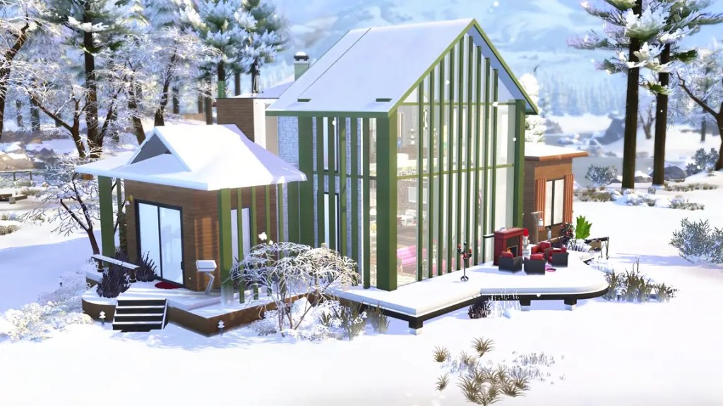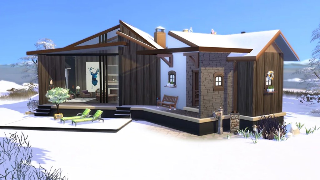 Bespoke winter lodge: This home has a modern mezzanine at its heart, with double-height glass windows. The exposed beams, sourced from base game debug items, add a rustic charm that contrasts beautifully with the contemporary element. ↓